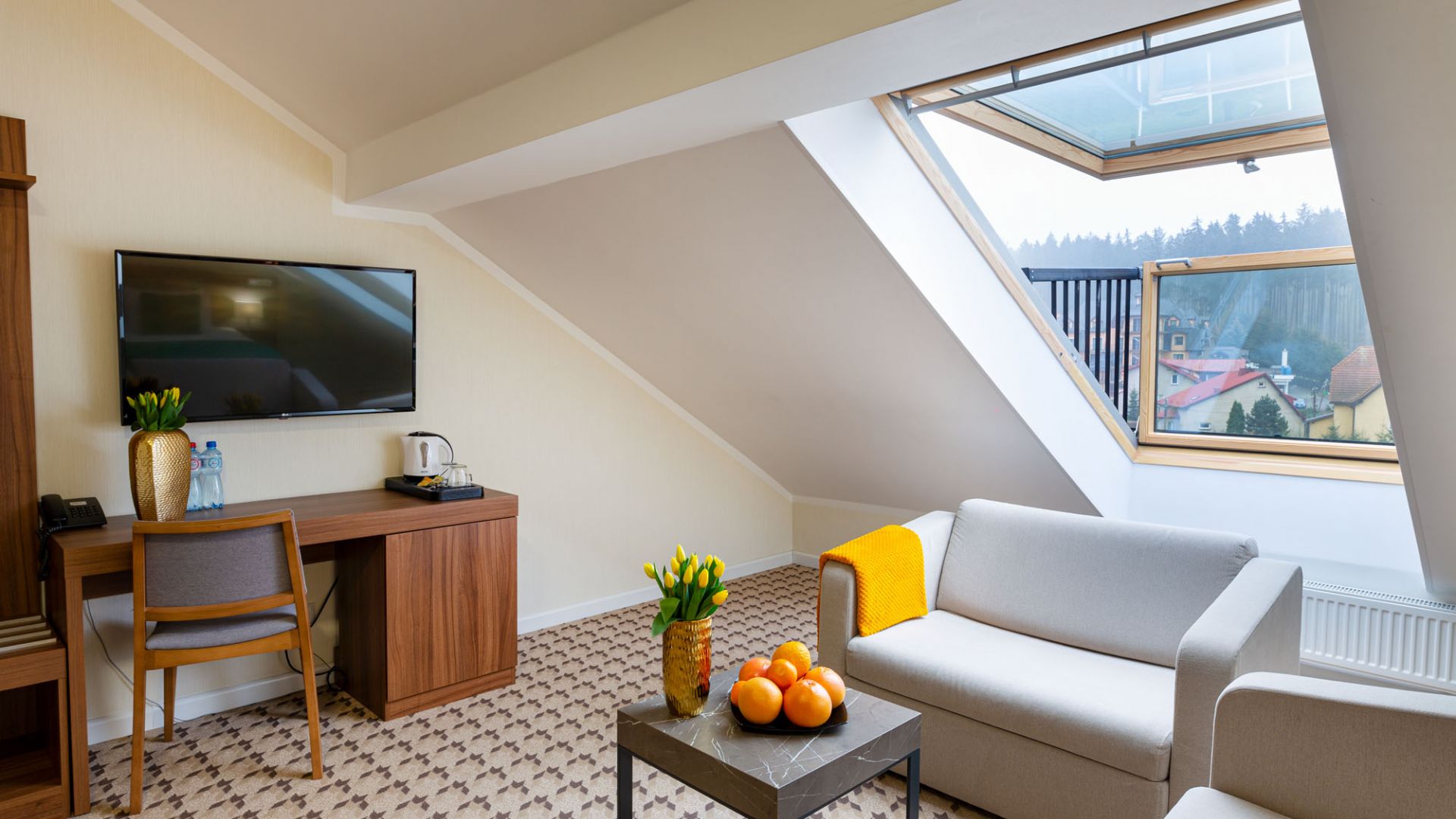 Pokój rodzinny to komfortowy pokój o powierzchni łącznej około 20 m2. Przeznaczony dla 2 osób dorosłych oraz 2 dzieci do lat 12. Dzieci do 3 lat śpiące z rodzicami bez świadczeń bezpłatnie, osobne łóżko dla dziecka dodatkowo płatne. Pokój usytuowany na najwyższym 5 piętrze Hotelu. Charakteryzuje się skosami oraz dużymi oknami dachowymi, które po otwarciu tworzą balkon.